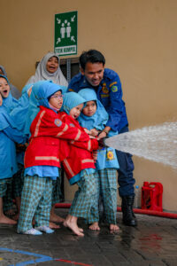 Dalam sesi berikutnya, guru menyiapkan skenario simulasi kebakaran di halaman sekolah. Petugas pemadam kebakaran memperagakan cara memadamkan api secara sederhana dan aman menggunakan air serta alat pemadam khusus. Kegiatan dilakukan dengan pengawasan ketat. Anak-anak juga diajarkan langkah penting saat melihat api, seperti tidak bermain api, tetap tenang, dan segera memanggil orang dewasa.